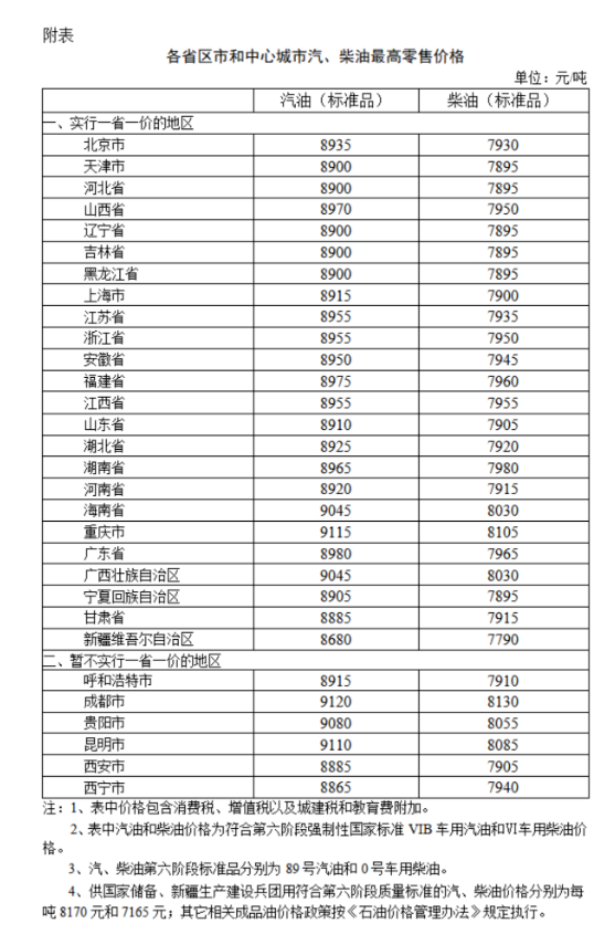 附:各省区市和中心城市汽、柴油最高零售价格表,详细列出了各地的油价调整情况。