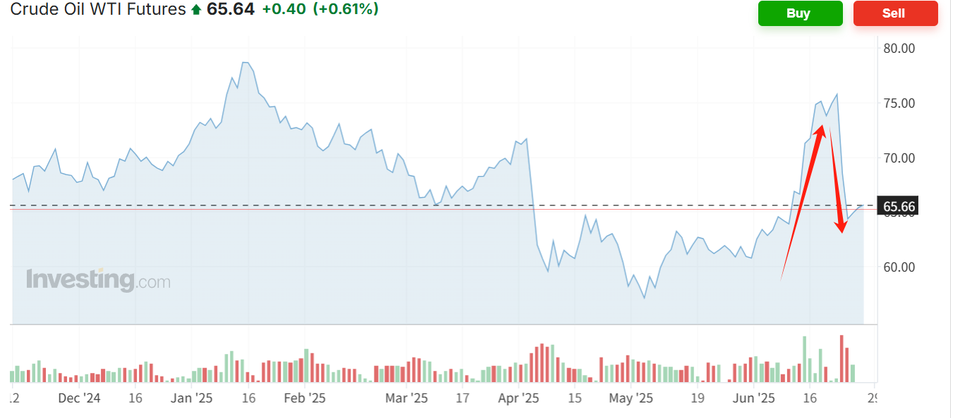 但据央视新闻消息,当地时间6月24日,伊朗和以色列宣布正式停火。随后市场担忧情绪有所缓解,原油价格快速回落至68美元以下。截至发稿,WTI原油期货报65.3美元/桶,布伦特原油期报67.04美元/桶。