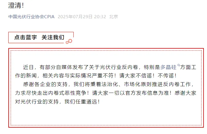 昨夜,中国光伏行业协会发布澄清公告。