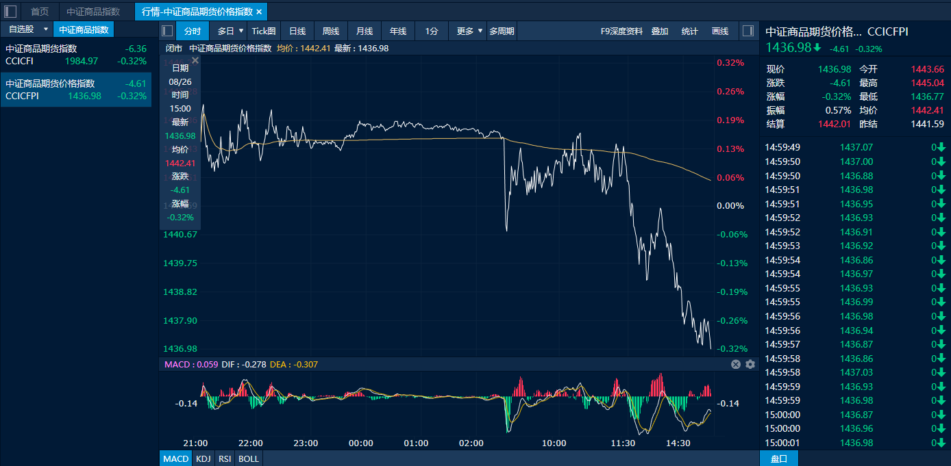 截至26日下午收盘,中证商品期货价格指数收报1436.98点,较前一交易日下跌4.61点,跌幅0.32%;中证商品期货指数收报1984.97点,较前一交易日下跌6.36点,跌幅0.32%。