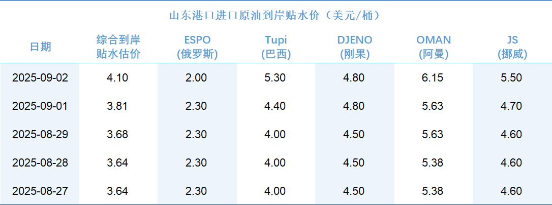 新华财经北京9月3日电(郑大伟) 截至2025年9月2日,新华·山东港口·金联创原油价格指数(SPG CIPI)报1199.90点,较前一交易日上涨14.46点,涨幅1.22%;原油进口即期价格达到73.30美元/桶,折合人民币3755.63元/吨,显示出原油市场的一定活跃度。山东港口进口原油综合到岸贴水估价也上升至4.10美元/桶,较前一交易日上涨0.29美元/桶,涨幅达7.61%,这一变化对原油进口成本有直接影响。