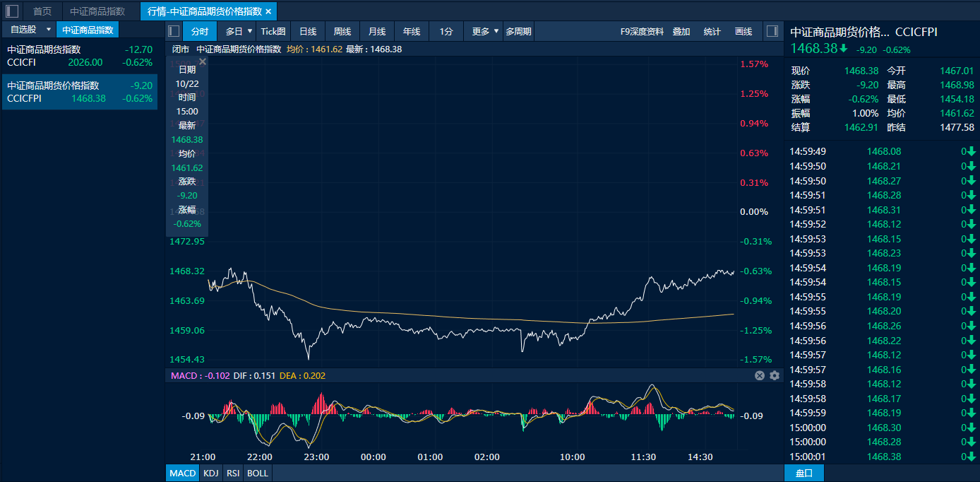 截至22日下午收盘,中证商品期货价格指数收报1468.38点,较前一交易日下跌9.20点,跌幅0.62%;中证商品期货指数收报2026.00点,较前一交易日下跌12.70点,跌幅0.62%。