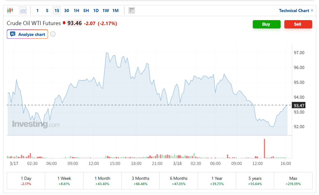 (美国WTI原油期货15分钟走势图来源:英为财情)