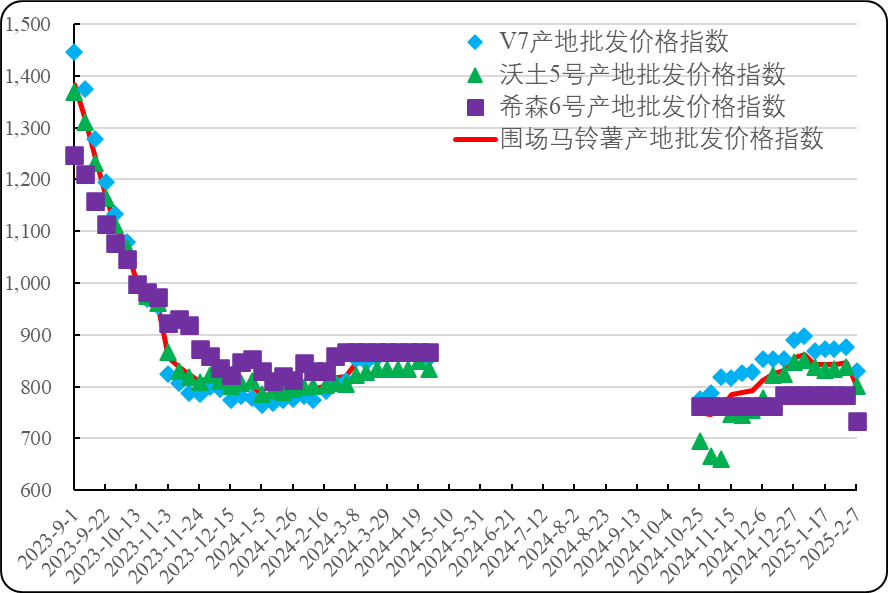 春节过后,全国蔬菜批发价格呈现加速下滑趋势,与此同时,商品薯销地批发价格也呈现疲软态势。随着物流成本的逐步回归正常,国内主产区马铃薯的出货速度明显加快,伴随而来的是出货价格的下行。特别地,围场窖藏薯因出货加快,其价格出现了较大幅度的下跌。另一方面,全国种薯及初级薯制品市场虽缓慢恢复,但短期内价格保持稳定。据新华·围场马铃薯产地批发价格指数显示,截至2025年2月7日,该指数为802.71点,环比下跌5.21%,同比则微涨1.06%。同时,新华·围场马铃薯库存指数为58.00%,环比下滑2.87个百分点,出货速率已恢复至年度均值以上。预计随着春节后终端消费需求的快速下滑,全国商品薯产销两地的批发价格将继续呈现下行趋势。