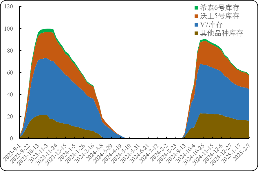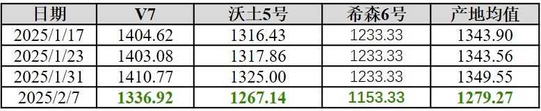 同期,威宁洋芋产地批发价格稳定且略有走弱,而出货速度略有加快的定西商品薯整体出货价格则出现小幅下跌。截至2月7日,威宁洋芋产地批发价报1511.09元/吨,环比下跌0.15%;定西商品薯出货均价为1390.72元/吨,环比下跌1.39%。此外,V7品种的出货比例有所下调,预计销售后期价格有望回升。