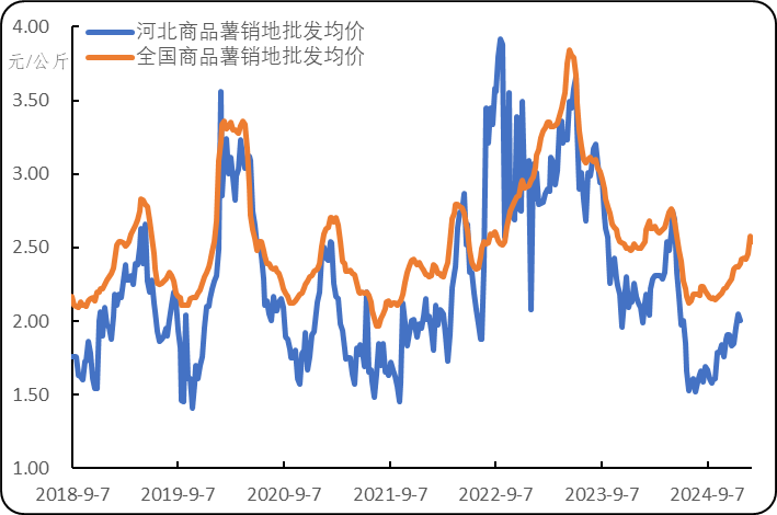 图2. 近年全国和河北商品薯批发周度均价走势图
