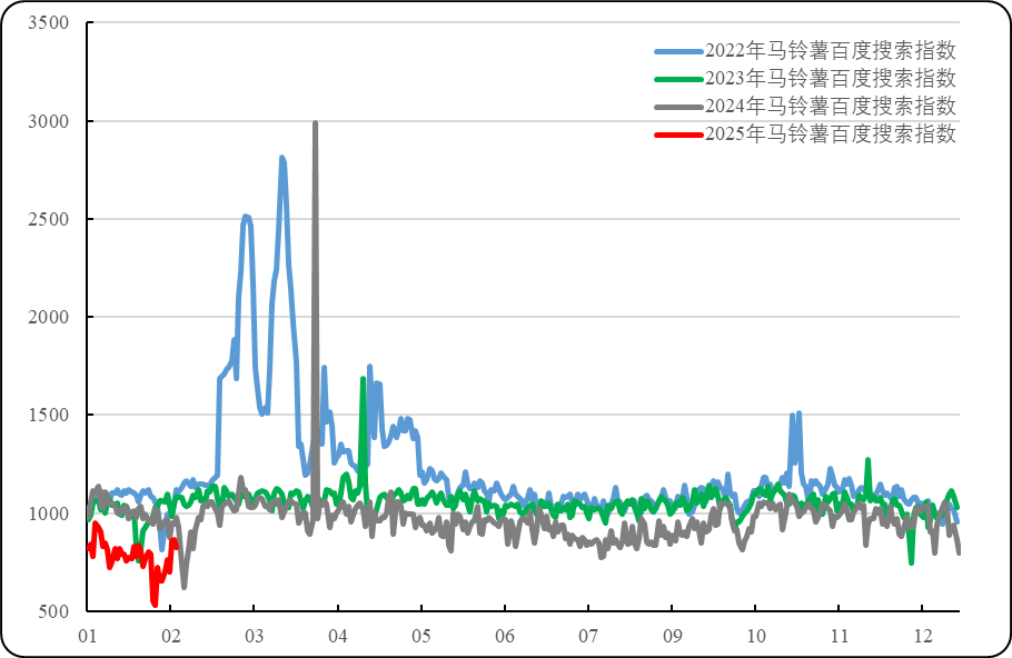 马铃薯互联网搜索指数有所回升,这反映出节后商品薯供销交易活动的加快。截至2月7日,马铃薯百度搜索指数七日线为767.14点,环比下滑11.20%,同比跌幅则缩小至15.71%。