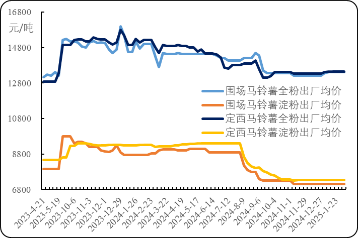 随着节后生产的逐步恢复,全国初级薯制品的出货速度缓慢,但价格保持稳定。截至2025年2月7日,围场马铃薯淀粉出厂价为7100.00元/吨,环比持平,同比下跌18.86%;围场马铃薯全粉出厂价为13414.29元/吨,环比同样持平,同比下跌10.57%。