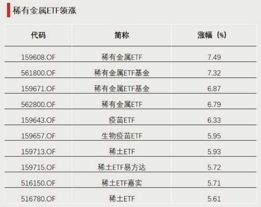 除稀有金属主题ETF外,稀土主题ETF也收获较高涨幅,4只稀土主题ETF涨幅超5%。另有两只疫苗主题ETF涨幅在6%左右。