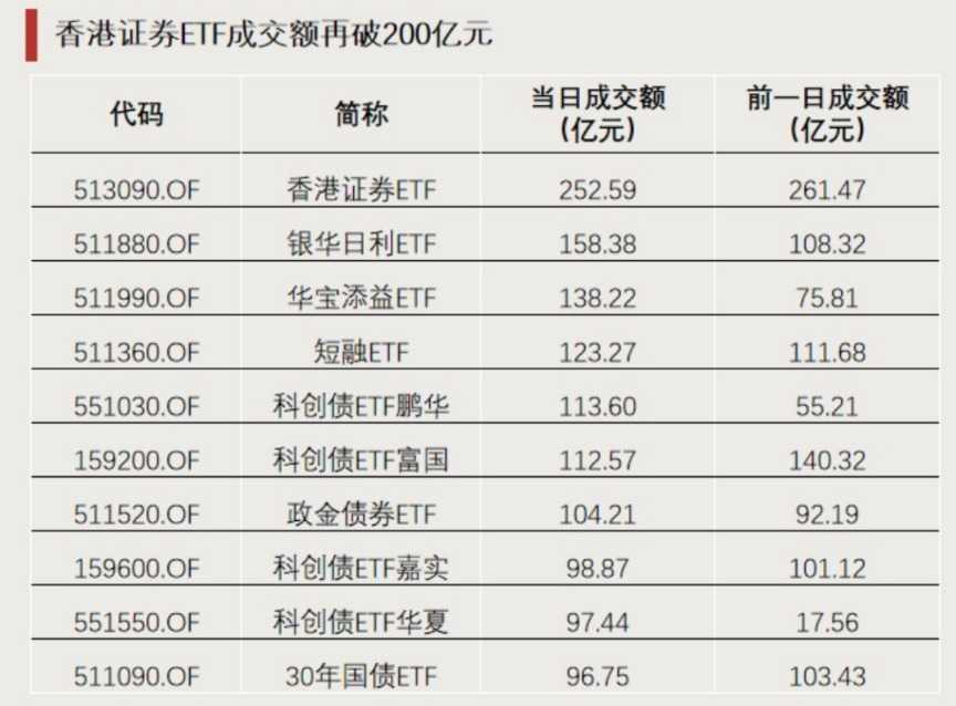 7月24日,截至收盘,ETF两市成交额3798.24亿元。具体来看,7月24日,香港证券ETF(513090)成交额达252.59亿元,位居全市场首位。这是继该ETF于7月23日成交额达261.47亿元后,成交额再度突破200亿元。