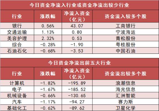 在申万一级行业中,仅3个行业实现资金净流入,其中银行业资金净流入43.07亿元,位居各行业之首。