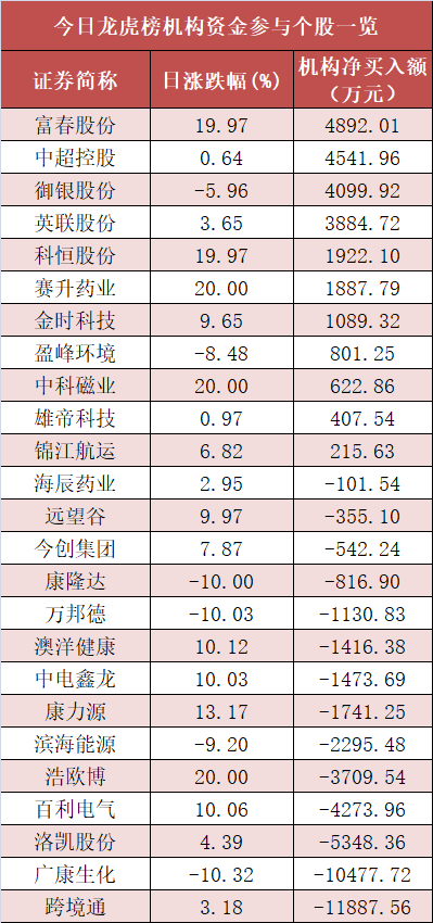 盘后龙虎榜数据显示,机构现身多只股票,富春股份等股票呈现机构资金净买入,跨境通等股票则呈现机构资金净卖出。