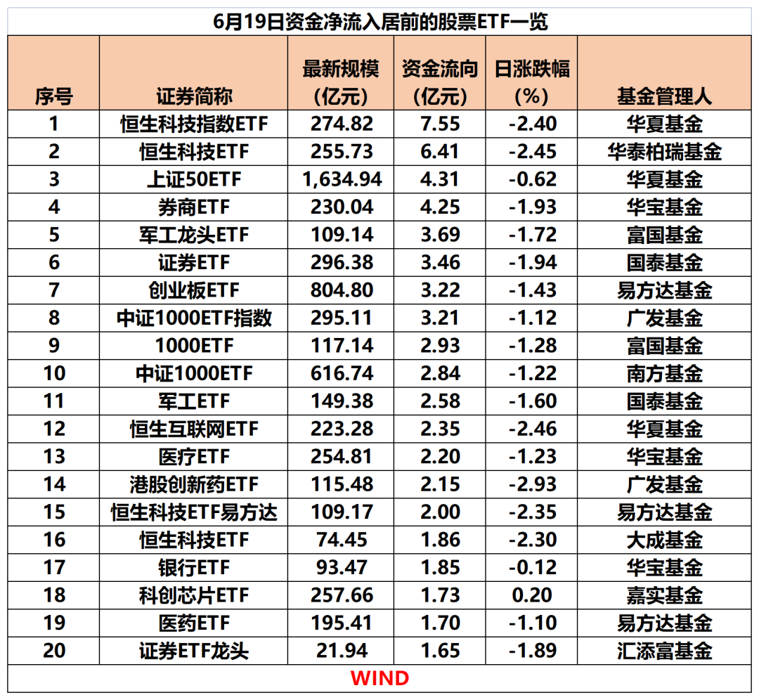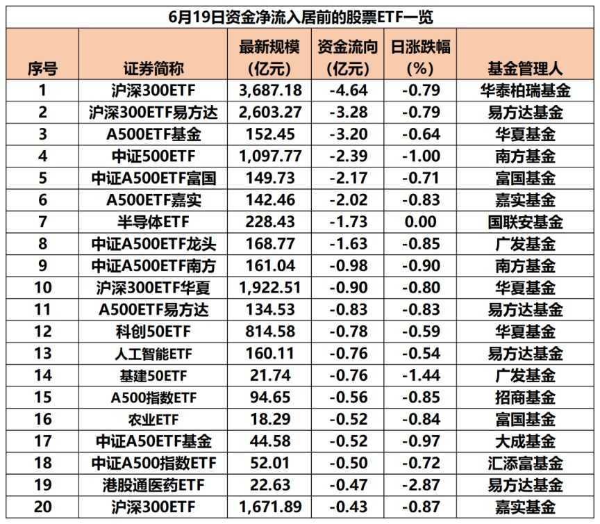 6月19日,A股市场震荡走低,股票ETF整体资金净流入50.9亿元。其中,沪深300ETF、中证500ETF等宽基ETF资金净流出居前,而港股相关ETF产品成为吸金主力。
