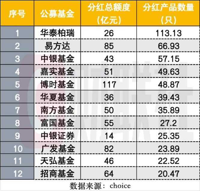 包括华泰柏瑞在内,今年来分红超20亿元的公募已有12家。位列华泰柏瑞之后,易方达、中银基金、嘉实基金、博时基金分别以66.93亿元、57.15亿元、49.63亿元、48.87亿元的分红总额,排名公募前五。