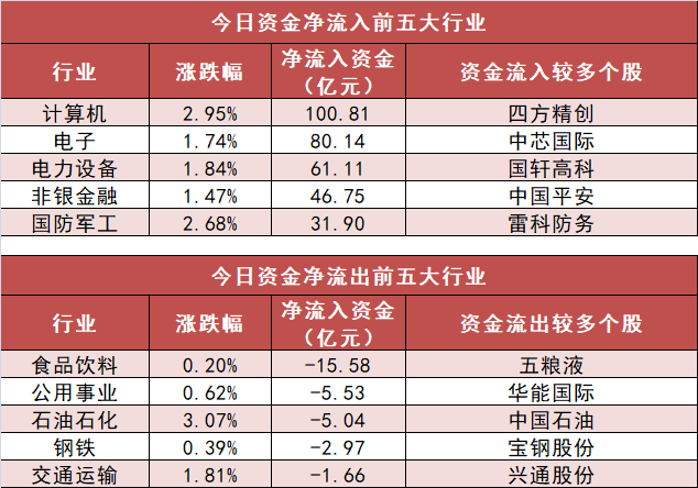 申万一级行业中,26个行业实现资金净流入,其中计算机行业净流入100.81亿元居首,显示出该行业的强劲吸引力。