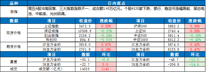 周五A股冲高回落,三大指数涨跌不一,上证指数收涨,深证成指、创业板指收跌,成交额1.45万亿元。个股4120家下跌,银行、稳定币涨幅居前,固态电池、中船系、光伏回调。截至收盘,上证指数报3472.3点,涨0.32%;深证成指报10508.8点,跌0.25%;创业板指报2156.2 点,跌0.36%;沪深300报3982.2点,涨0.36%;上证50报2740.4点,涨0.58%;中证500报5911.4点,跌0.19%;中证1000报6312.2点,跌0.48%。 期指方面,IF2509涨0.67%,IH2509涨0.19%,IC2507涨0.42%,IM2509涨0.47%。IF、IH、IC、IM当季年化基差率分别为-5.43%、-3.97%、-11.56%、-14.83%。