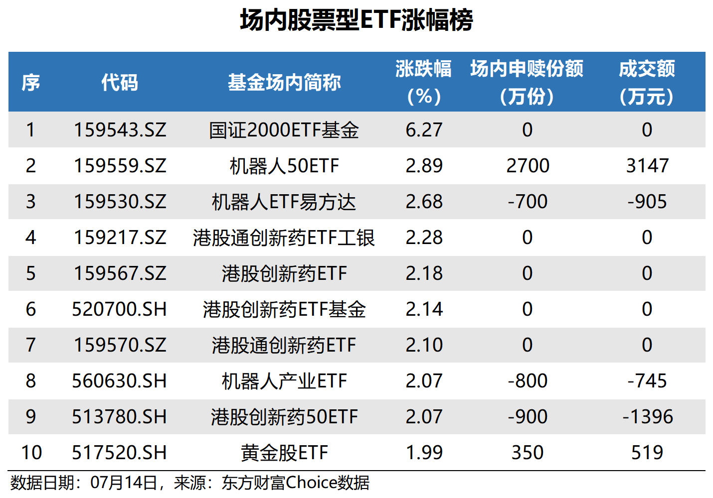数据显示,昨日场内股票型ETF中,国证2000ETF基金、机器人50ETF、机器人ETF易方达涨幅居前。其中,国证2000ETF基金涨幅最大,为6.27%,成为市场关注的焦点。
