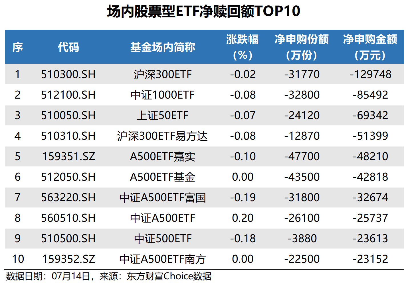 数据还显示,昨日净赎回金额最多的场内股票型ETF为沪深300ETF,净赎回金额12.97亿元,这一数据反映了市场资金的流动情况。中证1000ETF也紧随其后,出现较大赎回。