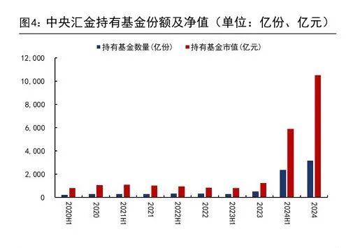 从中央汇金买入ETF的情况来看,自2023年10月底以来,中央汇金三次公告买入ETF,力度明显加大。据国信证券测算,截至2024年底,中央汇金持有ETF市值已经突破1.05万亿元。其中,中央汇金重仓的ETF以跟踪沪深300、上证50、中证500、中证1000等宽基指数的股票ETF为主。