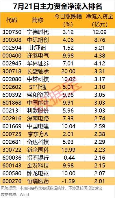 7月21日沪深两市主力资金净流出136.41亿元,创业板净流出94.3亿元,沪深300成份股净流出13.72亿元。机械设备等行业获主力资金净流入,计算机等行业净流出居前。宁德时代、比亚迪等个股获主力资金加仓。