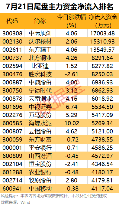 此外,还有北方铜业、比亚迪、胜宏科技、中鼎股份等尾盘主力资金净流入金额居前,均超6000万元。