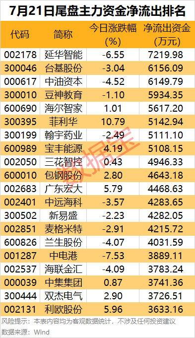 台基股份、中油资本、豆神教育、海尔智家、菲利华等尾盘主力资金净流出金额均超5000万元。