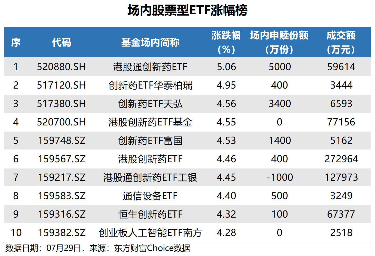 数据显示,昨日场内股票型ETF中,港股通创新药ETF、创新药ETF华泰柏瑞、创新药ETF天弘涨幅居前。其中,港股通创新药ETF涨幅最大,为5.06%。