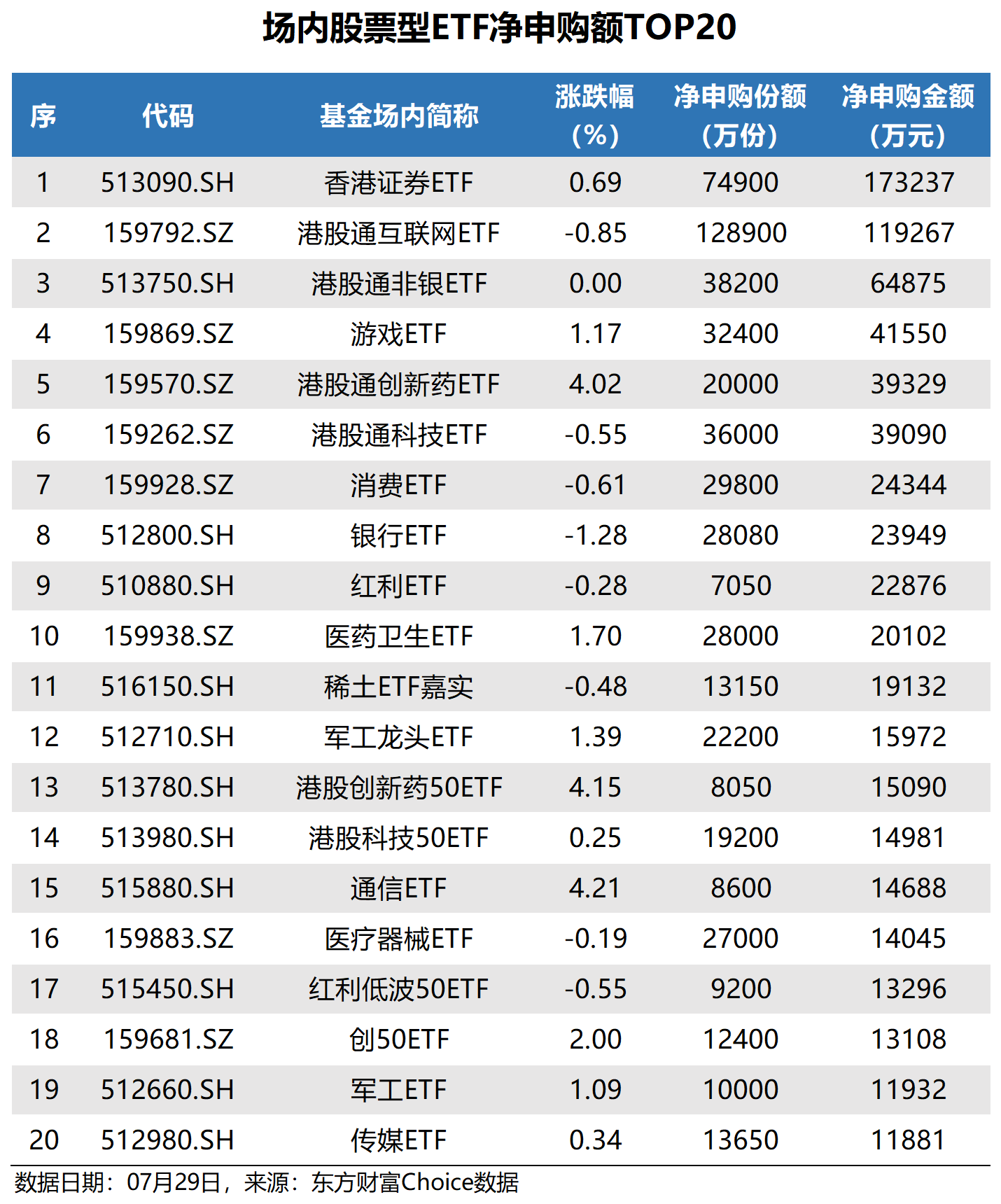 昨日,净申购金额最多的股票型ETF为香港证券ETF,净申购金额为17.32亿元。此外,港股通互联网ETF和港股通非银ETF也获购居前,净申购金额依次为11.93亿元和6.49亿元。