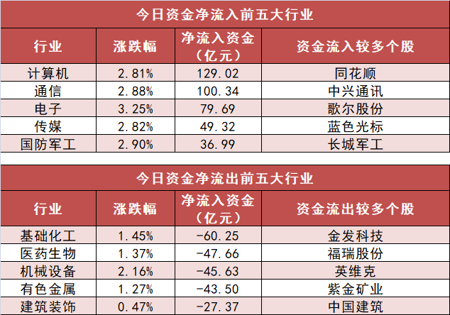 3.计算机行业净流入129.02亿元居首