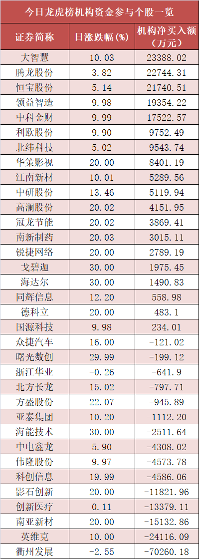 盘后龙虎榜数据显示,机构现身多股,其中大智慧等股票呈现机构资金净买入,衢州发展等股票呈现机构资金净卖出,龙虎榜机构动向活跃。