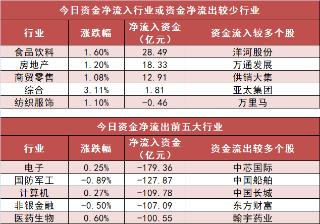 申万一级行业中,4个行业实现资金净流入,其中食品饮料行业净流入28.49亿元居首。