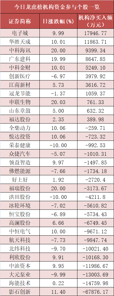 盘后龙虎榜数据显示,机构现身多股,其中电子城等股票呈现机构资金净买入,影石创新等股票呈现机构资金净卖出。