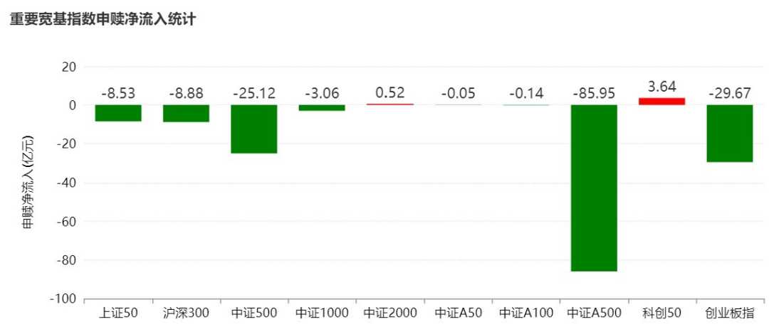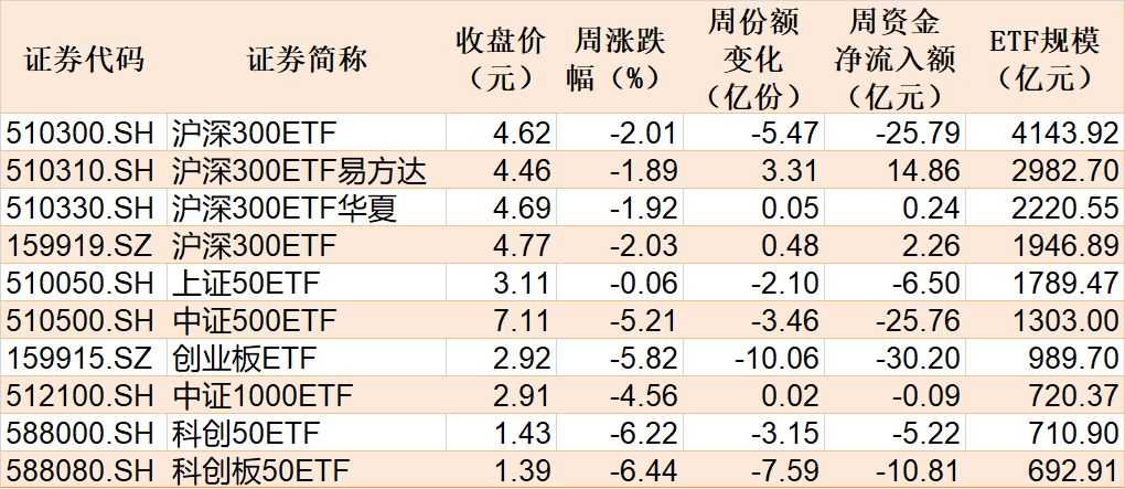 细分来看,主要宽基指数整体资金申赎统计显示,本周科创50净流入3.64亿元,中证A500净流出85.95亿元。具体ETF方面,规模较大的10只宽基指数ETF本周合计净流出87.01亿元,其中沪深300ETF、中证500ETF、创业板ETF净流出均超25亿元,沪深300期货关联产品资金动向受关注。
