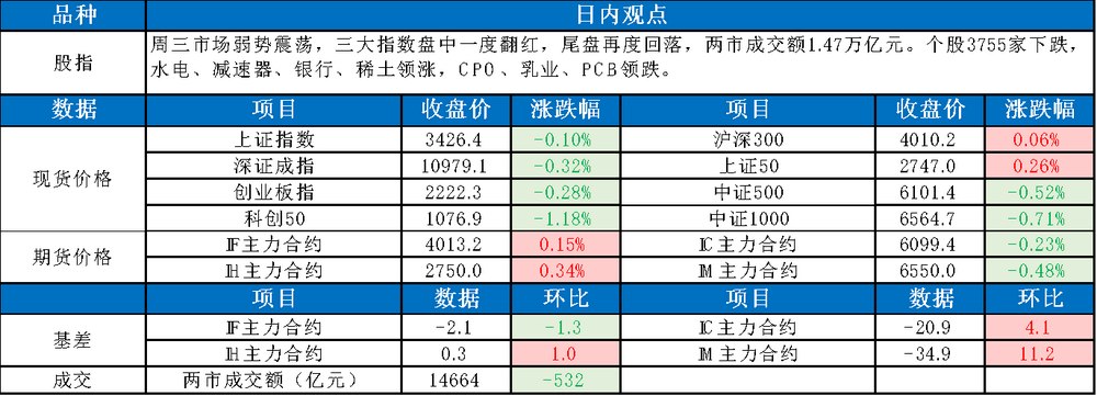 周三,市场呈现弱势震荡格局,三大指数盘中一度翻红,尾盘回落,两市成交额达1.47万亿元。个股普跌,水电、减速器、银行、稀土板块表现突出,CPO、乳业、PCB等板块领跌。截至收盘,上证指数报3426.43点,微跌0.10%;深证成指报10979.05点,跌0.32%;创业板指报2222.35点,下滑0.28%。沪深300指数微涨0.06%,上证50指数涨0.26%,中证500指数跌0.52%,中证1000指数跌0.71%。