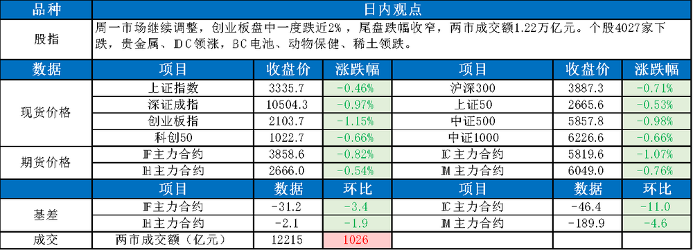 周一市场延续调整态势,创业板一度接近2%跌幅,尾盘收窄,两市成交额达1.22万亿元。个股方面,4027家下跌,贵金属、IDC板块表现突出,BC电池、动物保健、稀土板块领跌。主要指数收盘情况如下:上证指数跌0.46%,深证成指跌0.97%,创业板指跌1.15%,沪深300跌0.71%,上证50跌0.53%,中证500跌0.98%,中证1000跌0.66%。期指方面,IF2504跌0.79%,IH2504跌0.53%,IC2504跌1.07%,IM2504跌0.75%。资金面方面,3月31日央行净投放317亿元。