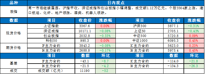 周一,市场延续震荡格局,沪指持平,深证成指和创业板指小幅回调,成交额为1.12万亿元。个股方面,3564家上涨,港口航运、化纤、地产板块表现突出,酒类、机器人板块表现不佳。截至收盘,上证指数报3367.58点,涨幅0%;深证成指报10171.09点,跌幅0.08%;创业板指报2032.76点,跌幅0.33%;沪深300报3877.15点,跌幅0.31%;上证50报2705.09点,跌幅0.43%;中证500报5720.79点,涨幅0.09%;中证1000报6095.34点,涨幅0.45%。期指方面,IF2506下跌0.08%,IH2506下跌0.17%,IC2506上涨0.23%,IM2506上涨0.45%。IF、IH、IC、IM当季年化基差率分别为-7.79%、-5.65%、-14.69%、-16.73%。