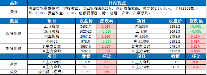 周四,市场呈现震荡整理态势,沪指微涨,创业板指上扬0.26%,深证成指略跌,成交额达到1.3万亿元。个股方面,2868家下跌,CPO、黄金珠宝、CRO、创新药板块表现突出,而港口航运、农业、白酒板块领跌。截至收盘,上证指数报3402.66点,微涨0.01%;深证成指报10234.33点,下跌0.11%;创业板指报2067.15点,上涨0.26%;沪深300指数报3892.20点,下跌0.06%;上证50指数报2691.28点,下跌0.03%;中证500指数报5799.93点,上涨0.12%;中证1000指数报6192.22点,上涨0.09%。期指方面,IF2506上涨0.06%,IH2506上涨0.02%,IC2506上涨0.21%,IM2506上涨0.08%。IF、IH、IC、IM当季年化基差率分别为-7.50%、-6.98%、-13.02%、-17.43%。