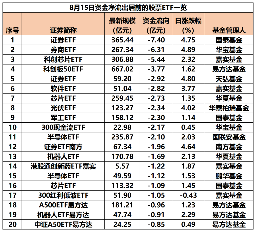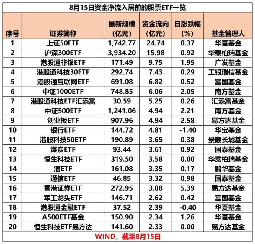 8月15日股票ETF资金净流入超百亿,宽基ETF成吸金主力