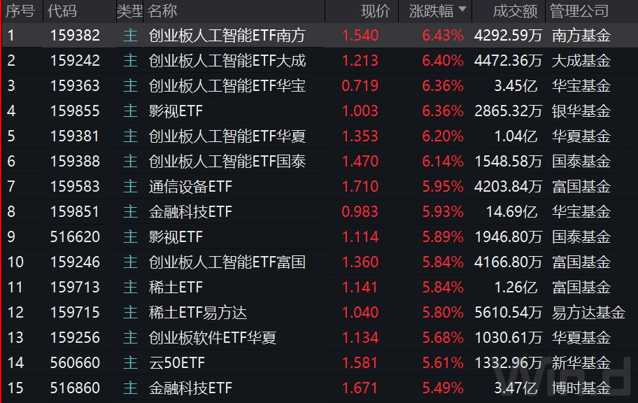 股票ETF整体表现活跃,24只涨幅超5%,人工智能、影视、金融科技、通信设备等行业主题ETF领涨,科创成长相关ETF领跌。从成交额来看,多只科创50ETF、A500ETF半日成交额在40亿元左右。