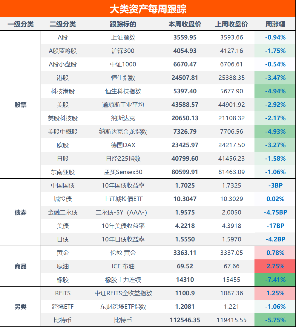 本周,中共中央政治局会议召开,深入分析研究当前经济形势,并对下半年经济工作作出部署。受美国关税政策和非农数据影响,全球市场受到冲击。上证指数收跌0.94%,3600点得而复失,中证1000指数下跌0.54%;恒生指数下跌3.47%,恒生科技指数下跌4.94%。