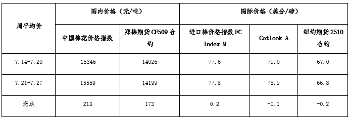 上周(7月21日-7月27日),国内市场普遍关注7月27日至30日在瑞典举行的中美新一轮经贸会谈,整体以观望为主,棉价维持震荡走势。尽管国内棉花商业库存同比下降、6月进口量持续低位引起供应趋紧预期,但受下游棉纺织企业销售不畅、订单不足影响,购棉需求同步走弱,国内棉价在前一周持续上涨的基础上有所回调。中国棉花价格指数(CCIndex 3128B)周均价为15559元/吨,环比上涨213元/吨;郑州期货主力合约CF509周均价14199元/吨,环比上涨173元/吨。国际市场,受全球大宗商品普遍下跌、美棉主产区天气正常新棉生长良好等因素影响,国际棉价缺乏明确利好支撑,周内依然维持弱势运行,内外棉价差环比扩大。Cotlook A指数周均价78.9美分/磅,环比下跌0.1美分/磅,1%关税下折人民币13949元/吨(含200元/吨港口费用),比中国棉花价格指数(CCIndex 3128B)低1610元,价差较前一周扩大219元;ICE棉花期货近期合约均价66.8美分/磅,环比下跌0.2美分/磅。