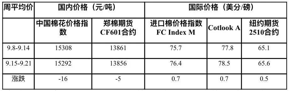 上周(9月15日-19日)国内棉价整体走弱,国际棉价先涨后跌。国内市场,纺织消费季节性好转,成品销售顺畅,但棉纱价格回升乏力,企业盈利未改善,棉花采购信心不足,以逢低补库为主,国内棉价延续回调走势。中国棉花价格指数(CCIndex 3128B)周均价15292元/吨,环比下跌16元/吨;郑州期货主力合约CF601周均价13856元/吨,环比下跌5元/吨。国际市场,美联储降息叠加美元走弱带动棉价上涨,但后期受美元走强、原油价格下跌等因素拖累棉价回落,周均价仍上涨,内外棉价差环比略有缩窄。Cotlook A指数周均价78.5美分/磅,环比上涨0.7美分/磅,1%关税下折人民币13795元/吨(含200元/吨港口费用),比中国棉花价格指数(CCIndex 3128B)低1497元,价差较前一周缩窄132元;ICE棉花期货近期合约均价65.6美分/磅,环比上涨0.5美分/磅。棉花市场波动,投资者需密切关注棉花期货行情。