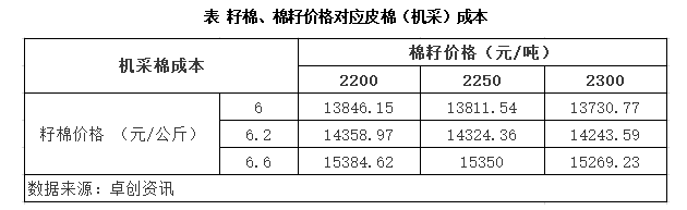 与此同时,从新棉成本端来看,近年来新疆棉花加工环节利润不理想,风险偏好显著降低,籽棉开秤价格较低,另外大部分轧花厂表示一旦成本与市场价格倒挂将停收籽棉。卓创资讯调研,当前北疆机采籽棉6.2元/公斤,新棉籽价格按2250元/吨、皮棉加工费按1000元/吨折算,皮棉成本在14324元/吨上下,贴水现货皮棉价格。具体籽棉价格对应的成本情况见下表。