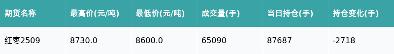 南财智讯5月29日电,南财金融终端盘后期货数据显示,郑州商品交易所的红枣主力合约收跌0.86%,收盘报价8685.0元/吨,日内资金流出达2270.18万元。这一动态反映了红枣期货市场的最新趋势,为投资者提供了重要的参考信息。以下是相关指标的详细表格: