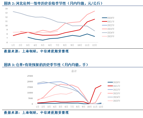 1. 与其他“反内卷”品种相比,红枣的时间节奏较为独特:在实际销售现实开始(约11月下旬)前,市场对于售价的想象、交易时间偏长,围绕“反内卷”逻辑交易的持续期、资金参与时间与空间(见图表1、2)可能偏长。本质上依旧是决心的问题。