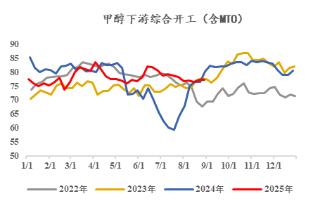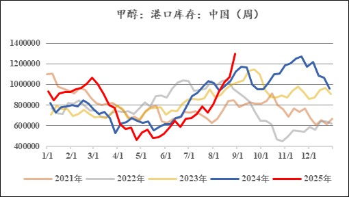 由于海外甲醇装置开工率持续处在高位,8月份国内甲醇到港量达到历史高位,同时,前期反内卷方案的提出导致甲醇期货和现货市场的情绪得以提振,虽然在7月港口就有累库趋势,但港口甲醇价格却与基本面背离,出现了上涨,下游利润因此受到压缩,进而导致下游需求转弱。供给持续高位而需求支撑不足导致港口在8月份快速累库,港口库存水平在8月底达近五年新高。
