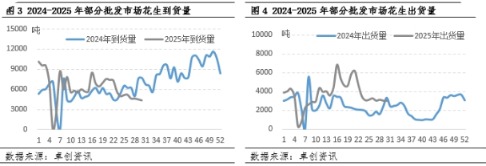 7月末国内新花生零星上市,陈米持货商出货积极性提升,但市场交易淡季,花生价格支撑有限。卓创资讯数据显示,批发市场采购到货量同比下滑,油厂收购暂停。新花生上市时间临近,但河南白沙产区受天气影响,上市进程及供应质量有待观望。