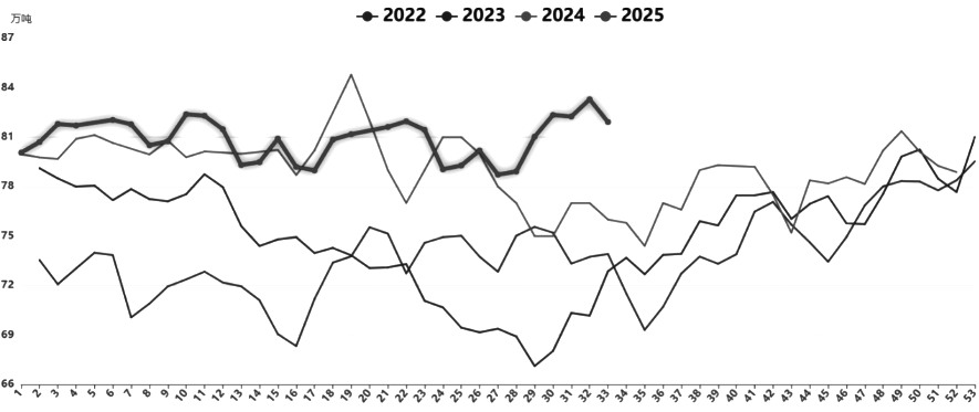 供应方面,烧碱装置检修预期将成为三季度末和四季度初的主要交易逻辑之一。虽然当前国内烧碱产量仍保持在80万吨/周以上的高位,但是8月已经开始逐渐下降。同时,后期仍有较多装置有检修计划,包括安徽红四方、江苏新浦化学、山东海化、烟台万华、河北冀衡等,届时供应会进一步下降,给价格带来较强的支撑,烧碱供应趋紧态势明显。